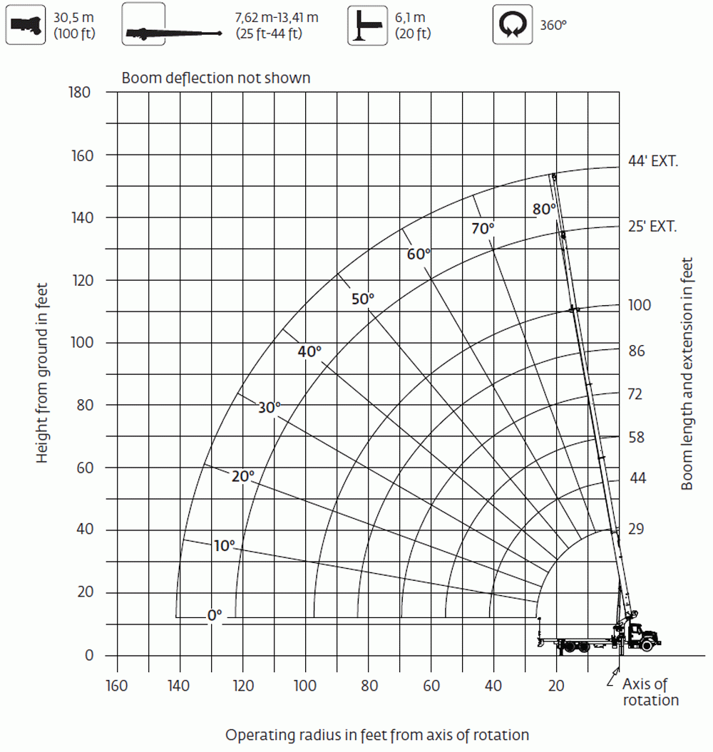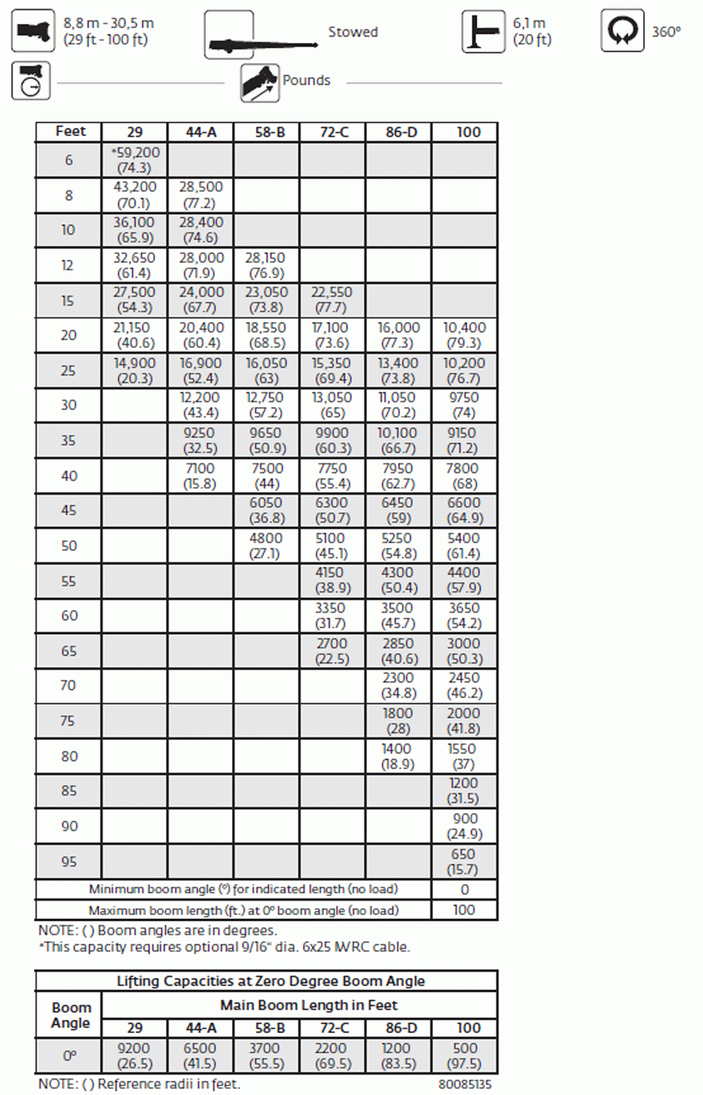 Warning: All load, rating, and capacity charts / images shown on this site are for general reference only! Always consult with your equipment manufacturer reguarding rated load capcity of your crane prior to operation.