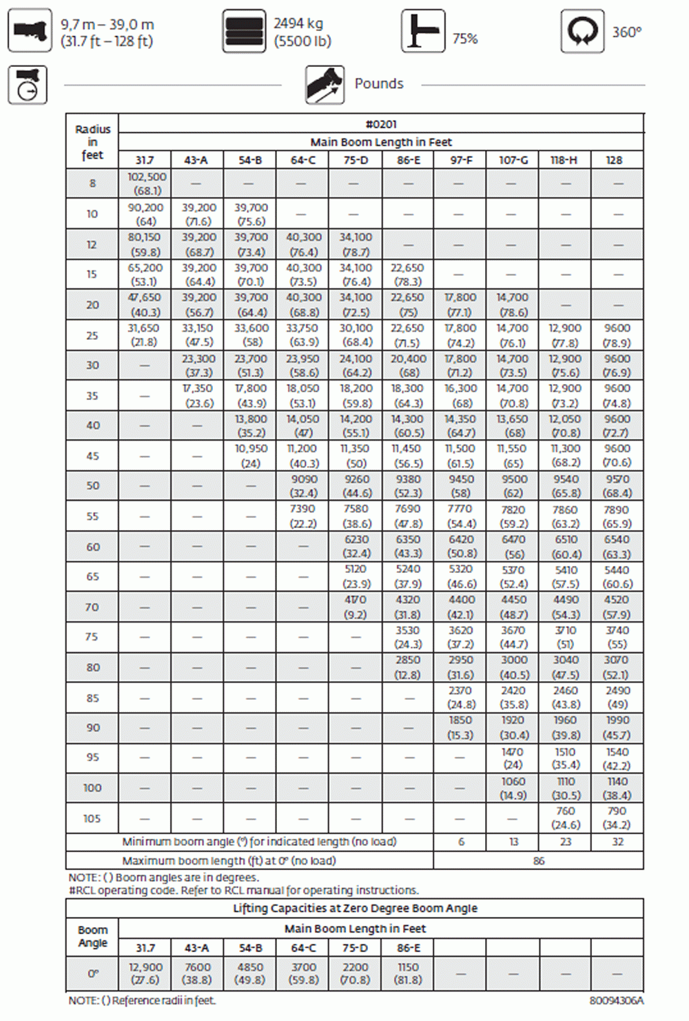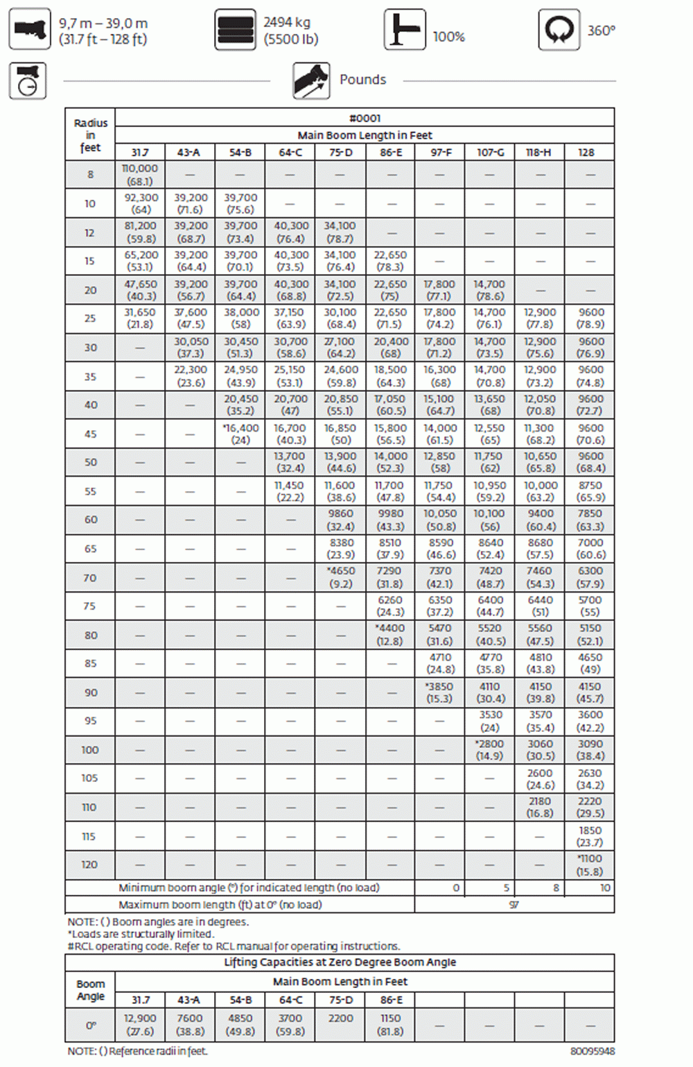 | Boom Length | 5 SECTION 31'8" - 128' |
